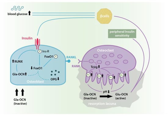 In the insulin-OCN-feed-forward-loop the binding of insulin to its receptor causes an Insulin receptor phosphorylation and activation which in turn causes the phosphorylation of Forkhead Box Protein O-1 (FoxO-1) and its inactivation. This reduces FoxO-1 levels, which otherwise would have inhibited Gla-OCN production and promoted osteosprotegrin (OPG) synthesis. At the same time, insulin signaling activates Runt-related transcription factor 2 (RUNX 2) which leads to a further increase in the expression and secretion of bio-inactive Gla-OCN. Insulin-dependent OPG reduction causes an increase in Receptor Activator of NF-κB/Receptor Activator of NF-κB-Ligand (RANK/RANKL) interaction and thus osteoclast differentiation and activation. This in turn leads to higher levels of bone resorption in acid resorption lacunae causing an increase in the pH dependent transformation of inactive Gla-OCN into under- or un-γ-carboxylated Glu-OCN and its release from the extracellular matrix (ECM). In its soluble and bioactive form Glu-OCN causes an improved peripheral insulin sensitivity as well as further β-cell activation and a consequent drop in blood glucose thus multiplying insulin’s physiological effects [,].