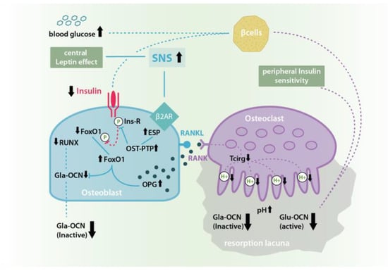 Similar experiments with leptin-KO-mice also showed this hormone’s positive peripheral effect on bone formation. However, unlike insulin, leptin also seems to have a negative central influence on bone remodeling via a hypothalamic relay and the activation of the sympathetic nervous system (SNS) [,,]. In experiments with intracerebroventricular leptin injections, SNS-signaling leads to a β2A-receptor-stimulation in osteoblasts, which increases the expression of the embryonic-stem-cell-phosphatase (ESP) gene and causes a promotion of osteoclast differentiation and osteoblast testicular tyrosinphosphatase (OST-PTP) activity, which restrains the above described insulin-OCN-feed-forward-loop by a dephosphorylation of the osteoblast insulin receptor (for further details, see Figure 1 and Figure 2) [,,,,,].