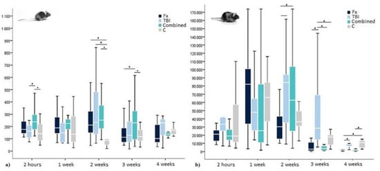 For the induction of TBI in the TBI and combined group, the standardized model of controlled cortical impact injury (CCII) was used []. Animals were mounted on a stereotactic device (Stoelting, Wood Dale, IL USA). A sagittal and temporal incision of the skin was followed by skin mobilization and preparation of the left temporal muscle. After craniotomy of the parieto-temporal region with a micro drill, a 7 × 7 mm bone window was lifted, carefully sparing the Dura mater. TBI was induced in a standardized manner (penetration depth 0.25 mm, impact velocity 3.5 m/s, contact duration 150 ms) with a pneumatic impactor device (AMS 201, AmScien Instruments, Richmond, VA, USA). The preserved piece of cranial bone was repositioned and fixed with dental cement (Hoffmann, Berlin, Germany) afterwards in order to simulate a closed brain injury. Wound closure was performed as described above.