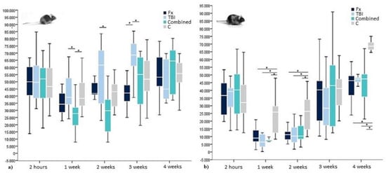- Locher, R.J.; Lunnemann, T.; Garbe, A.; Schaser, K.; Schmidt-Bleek, K.; Duda, G.; Tsitsilonis, S. Traumatic brain injury and bone healing: Radiographic and biomechanical analyses of bone formation and stability in a combined murine trauma model. J. Musculoskelet. Neuronal Interact. 2015, 15, 309–315. [Google Scholar] [PubMed]