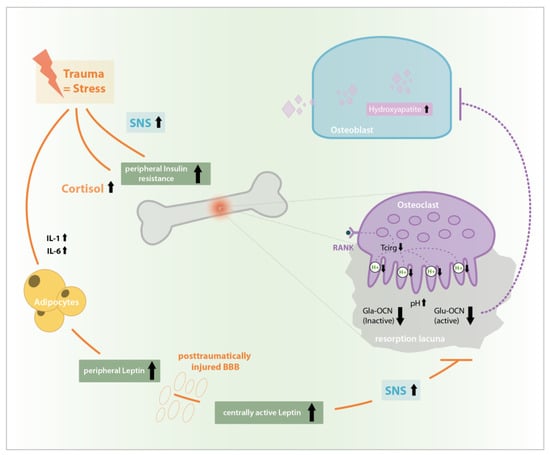 To conclude, extreme and specific alterations in hormone concentration induced via bony and central trauma are reactions to homeostasis disruption and have an impact on bone remodeling. A stress induced rise in interleukin (IL)-1 and Il-6 levels as well as cortisol levels cause an elevated peripheral insulin resistance causing changes in bone remodeling. However, especially the post-traumatic rise in peripheral leptin conducts its positive and negative direct and indirect effects on bone remodeling peripherally and via its central relay. Considering that, additionally, after TBI the blood brain barrier (BBB) is deeply impaired and the otherwise limited transfer of leptin to the CNS via specific Ob-Ra-transporters is abolished, unphysiologically elevated systemic leptin concentrations may pass unimpeded to the CNS [,], where they are able to cause an elevated SNS-reaction and induce a TBI specific high OCN drop or support bone remodeling by still unknown positive central leptin effects so that bone healing is accelerated in the case of concomitant TBI until the BBB is restored as shown in Figure 5.