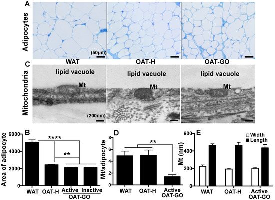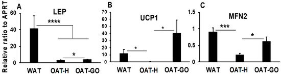 The weakness of our study is that many of our results rely on gene transcriptional expression. We performed protein analysis of UCP1 and mitochondrial markers using immunofluorescence and confocal microscopy; however, low levels of mitochondrial number per adipocyte and expression of relevant markers in WAT/OAT-H/OAT-GO prevented us from obtaining meaningful results.