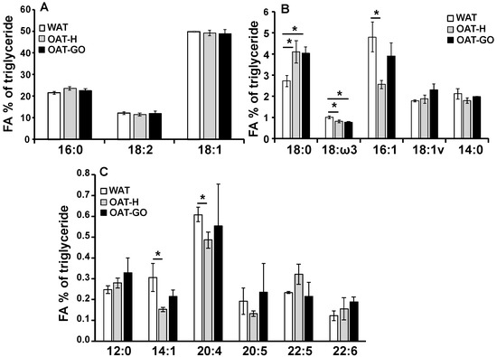 Depot specific fatty acid (FA) composition in OAT. Triglyceride composition of paired ex vivo fat tissues of OAT-H and WAT from three female individuals, also 3 unpaired ex vivo OAT-GO from female GO patients were analyzed by gas chromatography. Data presented as FAs percentage of triglyceride. (A) FAs of 16:0, 18:1, 18:2; (B) FAs of 14:0, 16:1, 18:0, 18:1v, 18:ω3; (C) FAs of 12:0, 14:1, 20:4, 20:5, 22:5, 22:6. Histograms = mean ± SEM of all samples studied. * p < 0.05.