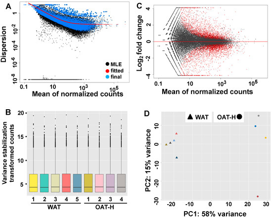 Figure 4. Transcriptional profiles of OAT comparing WAT. Differential gene expression (DGE) analysis was performed using a DESeq2 model generated from ex vivo female samples of OAT-H (n = 4) and WAT (n = 5) (R/Bioconductor DESeq2 package). (A) Shrinkage estimation of dispersion plots provided a visual means of examining dispersion estimates of genomic features relative to average expression strength [26]. Black points represent per gene gene-wise maximum likelihood estimates (MLE). The red curve represents the overall trend of the dispersion to mean dependence. Blue points represent gene-wise estimates following shrinkage towards the mean (correction for noise). Black points circled in blue are dispersion outliers that are not shrunk towards the DESeq2 fitted model. (B) Sample level box plots provided a visual means of comparing the distributions of counts between samples, and shown lower, median and upper quantiles and counts for outlying features. (C) MvA plot shows the log2fold changes of OAT-H vs. WAT attributable to a given variable of the mean of normalized counts for all samples. Red points indicate a variable with an FDR-p-value < 0.1, and points falling outside of the plotting area are depicted as open triangles pointing either up or down. (D) A PCA plot was summarized at the sample-level following the exclusion of non-informative features (total counts across all samples < 1) for the top 500 genes in terms of highest variance (Table S1B).In DGE analysis comparing OAT-H vs. WAT, we obtained 3790 genes with FDR-p significant (<0.05), which has 1746 genes (7.35%) up-regulated and 2044 genes (8.6%) down-regulated. A summarized log2fold change of genes over the mean of normalized counts is shown in the MvA plot (Figure 4C). A PCA-plot at sample-level (Figure 4D) showed a clear separation of samples from OAT-H or WAT that used the top 500 genes (FDR < 0.05) with highest variance (DGE data in Table S1B). - DGE analysis comparing OAT-H with WAT confirmed substantially lower expression levels of MFN2 and LEP, as well as a significantly increased expression of LEP receptor (LEPR) (Table S1A). Lower expression level of ADIPOQ (adiponectin) was seen in OAT-H compared with WAT with no difference in ADIPOQ receptors (Table S1A).In further analysis, we used a setting of log2fold > 0.5 or <−0.5; FDR-p < 0.05, and obtained 3277 genes (1495 up and 1782 down-regulated) for IPA® analysis. The up- or down-regulated gene set of OAT-H versus WAT was also subject to IPA® analysis. Pathway analysis suggested substantially reduced lipid metabolic activity (overlap-p < 0.01; z-score < −2) including FA metabolism, lipid uptake, uFAs conversion, lipolysis, lipid synthesis, and oxidation of lipid (e.g., ACADM, ECHS1) compared with WAT (Table S2). This evidence for reduced lipid metabolic activity was further supported by IPA® analysis of down-regulated genes. Furthermore, we identified significantly increased expression of the FA transporter, SLC27A6, in OAT-H compared with WAT.
