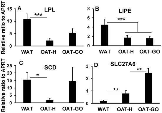 - Targeted QPCR analysis of genes highlighted in the whole transcriptome analysis confirmed substantially lower levels of elements of lipid metabolism including lipid uptake (LPL), lipolysis (LIPE) and uFAs conversion (SCD), and substantially up-regulated SLC27A6 (FA transporter) in OAT-H, when compared with WAT (Figure 5A–D). SLC27A6 has been reported as a transporter for long chain FAs uptake (>14 carbons) [27,28].