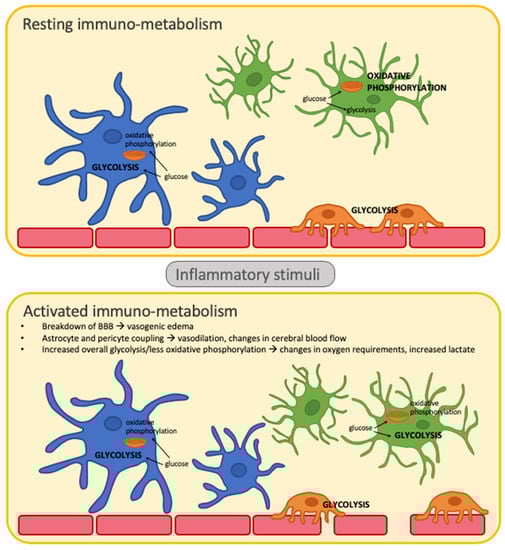 The immunometabolic environment also plays a role in neurovascular coupling. The neurovascular unit consists of neurons, interneurons, astrocytes, microglia, and their interaction with pericytes on capillaries, vascular smooth muscle cells on arterioles and arteries, and endothelial cells []. The interplay of cells in the neurovascular unit contributes to modulation of cerebral blood flow (CBF) as well as blood–brain-barrier (BBB) permeability, depending on the surrounding parenchymal milieu, and particularly whether there is concurrent inflammation []. Neuroinflammatory mediators (e.g., cytokines, chemokines, growth factors, damage-associated molecular patterns (DAMPs), substance P, neurokinins, matrix metalloproteinases) [] generally cause increased permeability, and secondary effects of this including vasogenic edema, or extracellular accumulation of fluid and extravasation of serum proteins (Figure 1) []. Pericytes are potent responders to surrounding neuroinflammation, and can constrict or dilate around vasculature to help regulate cerebral blood flow and match energy demands []. They also are important gate-keepers along the BBB together with endothelial cells and astrocyte end-feet, forming a tight barrier to peripheral cells []. Their role changes in response to cytokines released during neuroinflammation, causing changes in CBF and BBB permeability []. Such changes are facilitated through immunometabolic shifts and upregulation of baseline glycolysis to meet increased energy demands [,]. Energy metabolism in pericytes is driven by glycolysis to provide optimal functioning in oxygen deprived states, but it is still the primary source of energy during quiescent periods (Figure 1) [].