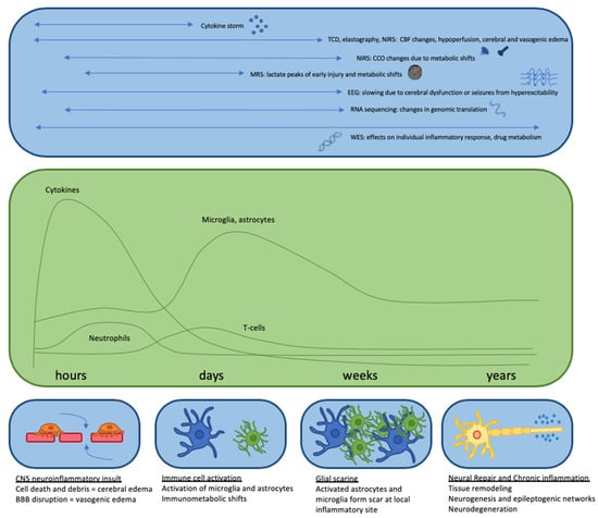 Time course depicting cellular CNS response to neuroinflammation and activation of immune cells, with timing of multi-modal monitoring. Top panel indicates different modes of monitoring during each stage of the CNS inflammatory response, and markers than can be measured. Middle panel indicates activation of different immune cells over time in response to a neuroinflammatory stimuli. Bottom panel indicates cellular and molecular changes over time.