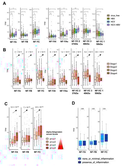 NF-Y expression levels according to viral infection, pathological stage and inflammation status. (A) Box plots of expression levels of NF-Y subunits at gene and isoforms levels in virus-positive and virus-free TCGA samples (stars indicate p value significance according to the following criteria: *** < 0.001; ** < 0.01; * < 0.05). (B) Box plots of expression levels of the three NF-Y subunits at gene and isoform levels divided according to pathological stage. (C) Box plot of NF-Y subunits expression levels after stratification of samples according to alfa-fetoprotein serum levels. (D) Box plots of NFY subunits in presence of inflammation compared with low/minimal inflammation.