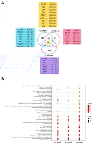 Analysis of HCC iCluster-specific gene expression. (A) Venn diagrams of Up-regulated genes in the three different iClusters and Transcription Factor Binding Sites (TFBS) enriched in their promoters, both in the core set and individually. (B) Dotplots of Reactome pathways enriched in upregulated gens of every iCluster.