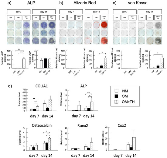 We analyzed the effect of TH on osteogenic differentiation of DPSCs in short-term culture. Alkaline phosphatase (ALP) staining showed that ALP activity of DPSCs cultured in osteogenic medium (OM) with TH was higher than that of DPSCs cultured in normal medium (NM) or OM at days 7 (Figure 1a). Moreover, Alizarin Red and von Kossa staining showed that DPSCs cultured in OM with TH had higher calcification than DPSCs cultured in NM and OM at day 14 (Figure 1b,c). Real-time PCR indicated that OM+TH-treated DPSCs have significantly higher expression levels of type I collagen alpha 1 (COLIA1) on day 7, and ALP and osteocalcin on day 14 than NM and OM-treated DPSCs. In contrast, no statistically significant differences were found in the expression levels of Runx2, a transcription factor involved in the differentiation of osteoblasts and chondrocytes, or Cox2, an enzyme regulating prostaglandins, at 14 days in the three groups (Figure 1d). These data confirmed the results of ALP, von Kossa, and Alizarin staining and indicated that OM+TH-treated DPSCs promote osteogenic differentiation more efficiently than the conventional osteogenic culture method.