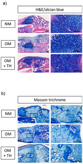 We performed histological analyses to investigate bone regeneration in endochondral ossification. Hematoxylin and eosin (H&E) and alcian blue double staining showed that the area of alcian blue-positive cartilaginous tissue was larger for OM+TH-treated DPSCs compared with the other groups (Figure 3a). Furthermore, the cell morphology of the calluses was similar in all groups (Figure 3a). We performed Masson’s trichrome staining to visualize calcification of new bone formation from cartilage. Masson’s trichrome staining demonstrated that OM+TH-treated DPSCs facilitated more bone mineralization than the others and more efficiently treated the fracture line, which was stained in pale blue (Figure 3b). Thus, OM+TH-treated DPSCs promoted cartilaginous callus formation.