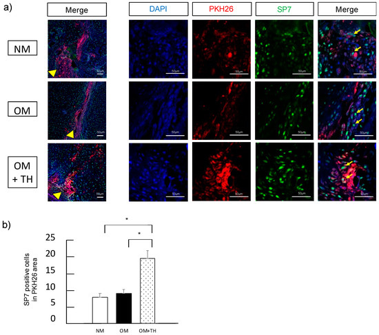To investigate whether transplanted DPSCs were localized in the fracture site and involved in fracture healing, we performed fluorescence histological staining using PKH26, a low toxicity red fluorescent label for live cells and immunofluorescence staining using SP7, a marker of mature osteoblasts. We found that transplanted DPSCs stained with PKH26 were localized in the fracture site. Moreover, transplanted DPSCs showed SP7 expression (Figure 4a). Analysis of SP7-positive cells in the area of PKH26 expression revealed that OM+TH-treated DPSCs had significantly higher SP7 expression than the other groups (Figure 4b). These results suggested that OM+TH-treated DPSCs were localized in the fracture site and were involved in fracture healing.