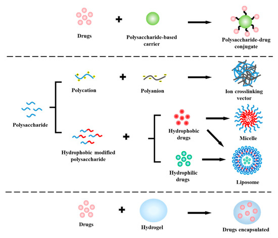 Natural or synthetic water-soluble polymers are usually applied to drug coupling to develop various prodrugs [33]. The composition of monosaccharides is diversified, with neutral hydroxyl groups, negatively charged carboxylic acid/sulfate groups, or positively charged amine groups [34]. Connections between monosaccharide units are variable (such as linear chain structure and branched chain structure), and there are also great changes in molecular weight. These complex chemical connections provide the basis for the huge chemical diversity of polysaccharides. Hydroxyl (-OH), carboxyl (-COOH), and amino (-NH2) on the polysaccharide molecules are the main active sites used to construct polysaccharide-based DDS. Polysaccharides can form polysaccharide–drug carriers through non-covalent interactions or covalent linkage reactions with drug molecules. Common construction methods include (i) esterification of hydroxyl groups with acylating agents, etherification of hydroxyl groups with alkylation agents, oxidation of primary alcohols to carboxyl groups, and oxidation of vicinal secondary hydroxyl groups to aldehydes; (ii) ester bonds consisting of hydroxyl groups linked to carboxyl groups, amide bonds consisting of carboxyl groups linked to amino groups, and hydrazone bond formed by reaction of -COOH and -NHNH2; (iii) interaction between amino groups and hydroxyl or carboxyl groups [35].