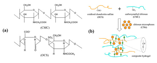 (a) Chemical structures of carboxymethyl chitosan (CMC) and oxidized chondroitin sulfate (OCS). (b) Reaction scheme to show a preparation of chitosan-based microspheres (CMs) embedded in CMC–OCS composite gel scaffold (CMs/gel). Modified from [21].