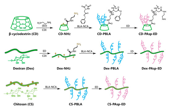 - Song, H.Q.; Dou, X.B.; Li, R.Q.; Yu, B.R.; Zhao, N.N.; Xu, F.J. A general strategy to prepare different types of polysaccharide-graft-poly(aspartic acid) as degradable gene carriers. Acta Biomater. 2015, 12, 156–165. [Google Scholar] [CrossRef]