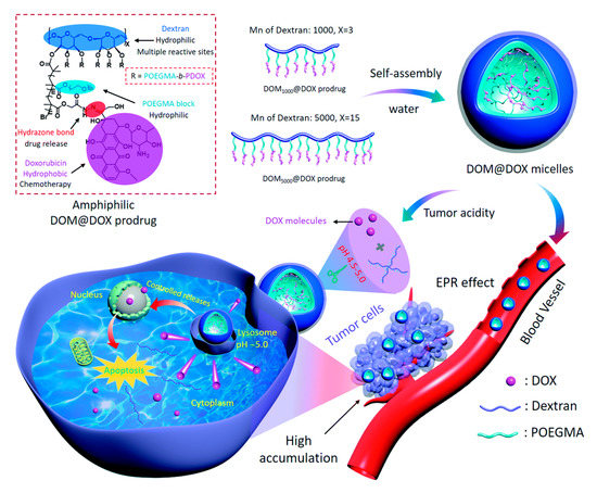 Schematic illustration of the synthetic route of acid-activated supramolecular nanoprodrug (DOM@DOX) micelles, drug accumulation via the enhanced permeability and retention (EPR) effect, cell internalization process, and pH-responsive drug release mechanism. Taken from [64].
