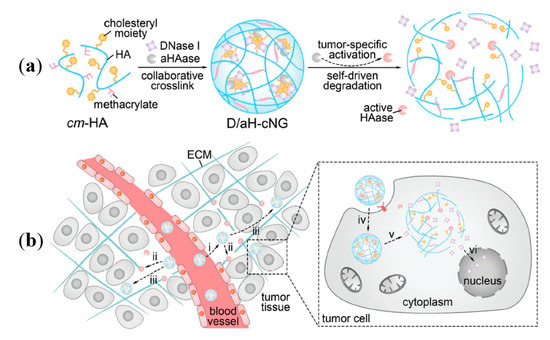 Hyaluronic acid (HA) is a non-sulfated glycosaminoglycan that mainly exists in vivo as sodium hyaluronate, which is formed alternately by D-glucuronic acid and N-acetyl-D-glucosamine [77]. HA is an important component of the extracellular matrix and is related to the movement and proliferation of cells [78]. In the field of tumor drug delivery, HA derived from the organism itself has low immunogenicity. More importantly, it can bind to the upregulated cluster of differentiation 44 (CD44) receptor in cancer cells and mediate the biological behavior of cells [79]. In a low-pH environment (such as lysosomes), HA could be degraded [80]. The degradation products can bind to macrophages or dendritic cell receptors, thereby activating the body’s innate immunity [81]. HA could be easily chemically modified by esterification reaction and peptide-coupling reaction, and has been used for targeted drug delivery of paclitaxel drugs (e.g., paclitaxel (PTX) and DOX) [82,83]. A recently reported tumor-specific self-degradable nanogel based on HA could be used for efficient delivery of intravenously administered protein drugs (Figure 6). Using a hyaluronic acid derivative named synthetic cholesteryl-6-aminohexylcarbamate methacrylated hyaluronic acid (cm-HA) as the matrix, researchers assembled collaboratively crosslinked nanogels (cNG) by using the hydrophobic interaction between cholesterol groups for physical crosslinking and radical polymerization of methacrylate groups for chemical crosslinking. In the weak acid environment of the tumor site, acid-activatable HAase (aHAase) in cNG was partially released, which degraded HA in the extracellular matrix and promoted the diffusion of the carrier in the matrix. After endocytosis, aHAase was fully activated by acid lysosomes, the cNG was degraded by activated aHAase, and then the protein drugs contained in cNG were released and exerted anti-tumor effects [84]. Li et al. prepared HA-based nanoparticles (HA-NPs) via ion pairing between positively charged DOX and negatively charged HA. Subsequently, HA-NPs were encapsulated in liposome carriers to obtain DOX-loaded HA-based liposomes (HA-LPs) with sustained release effects. The presence of HA made the carrier become tumor-targeting, significantly increased the blood circulation time of DOX, decreased the accumulation of DOX in normal tissues, and reduced the toxicity of DOX to vital organs of the body [85].
