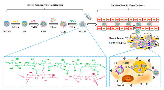 Schematic of HCLR nanocarrier fabrication and the in vivo fate in breast tumor targeting gene delivery. Taken from [92].