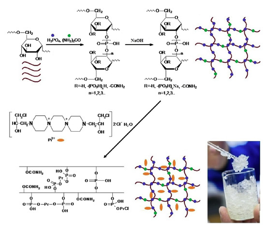 Schematic illustration of the synthesis of dextran phosphate (DP)–prospidine (Pr) hydrogels. Taken from [101].