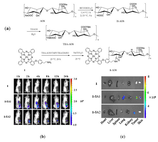 (a) Schematic diagram of the design and synthesis of a novel conjugation vehicle of a photosensitizer based on sodium alginate (SA). (b) In vivo fluorescence images of tumor-bearing KM mice after intravenous injection of SA-based carriers with different molecular weights. The red area represents tumor sites. (c) Ex vivo fluorescence images of organs and tumor at 24 h after injection of SA-based carriers with different molecular weights (1-SA1 is low-molecular-weight SA-based carriers). Modified from [106].