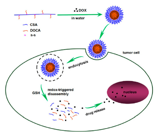 Chondroitin sulfate is a glycosaminoglycan derived from animal cartilage. When interacting with cancer cells, chondroitin sulfate can recognize and attach to the CD44 receptor, which can significantly promote the uptake of chondroitin sulfate-based DDS by cancer cells. In addition, chondroitin sulfate exposed to degrading enzymes (such as hyaluronidase) can be rapidly degraded, resulting in the drug release of chondroitin sulfate-based DDS [107]. However, unprocessed chondroitin sulfate has excellent water solubility, and its direct use as a drug carrier will lead to low drug utilization. Studies have shown that the conjugate system formed by cross-linking with chondroitin sulfate can significantly enhance the anti-tumor activity of hydrophobic drug molecules [108]. Compared with the unprocessed chondroitin sulfate, the cross-linked chondroitin sulfate has lower hydrophilicity and better shielding effect, which can be used as a specific carrier for active drugs [21]. Combining chondroitin sulfate with CS, the amphiphilic polymer formed can self-assemble into micelles. Modified with FA and encapsulated with bortezomib, the prepared micelles have a uniform size distribution and can release drugs in response to the slightly acidic tumor microenvironment. The modification of FA gives micelles the ability to actively target tumors and also promotes the uptake of drugs by tumor cells [109]. Liu et al. designed an amphiphilic polymeric micelle on the basis of chondroitin sulfate using the self-assembly strategy (Figure 10). The reduction-sensitive chondroitin sulfate A (CSA) was combined with deoxycholic acid (DOCA) through disulfide bonds, and the therapeutic drug DOX was encapsulated into the micelle simultaneously. The micelle released DOX in response under the high concentration of endogenous GSH, realizing specific treatment of tumors [110]. In organisms, chondroitin synthase-1 (CHSY1) is an enzyme responsible for the synthesis of chondroitin sulfate, which is related to the occurrence of some tumors, especially those highly expressed in the colorectal area. The biopolymer delivery carrier combined with chondroitin sulfate has a good targeting property in the delivery of anti-tumor drugs. It could target drugs to the colon; deliver genes to the tumor tissue; and reduce the expression of CHSY1, which has a good therapeutic effect on colon cancer [111].