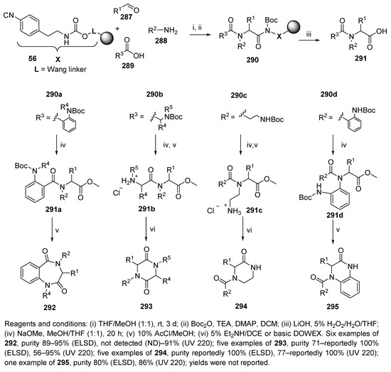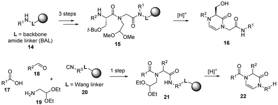 - Hulme, C.; Ma, L.; Kumar, N.V.; Krolikowski, P.H.; Allen, A.C.; Labaudiniere, R. Novel applications of resin bound α-amino acids for the synthesis of benzodiazepines (via Wang resin) and ketopiperazines (via hydroxymethyl resin). Tetrahedron Lett. 2000, 41, 1509–1514. [Google Scholar] [CrossRef]
