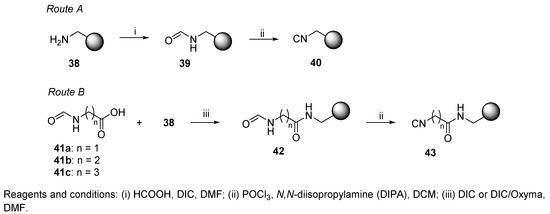 - Henkel, B.; Sax, M.; Dömling, A. New method for the preparation of solid-phase bound isocyanocarboxylic acids and Ugi reactions therewith. Tetrahedron Lett. 2003, 44, 7015–7018. [Google Scholar] [CrossRef]
