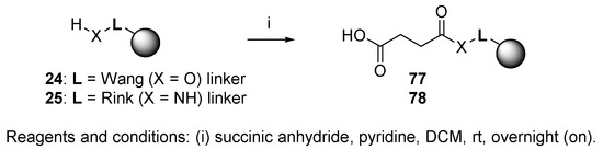 - Wiehn, M.S.; Jung, N.; Brase, S. Safety-catch and traceless linkers in solid phase organic synthesis. In Power Functional Resins in Organic Synthesis; Tulla-Puche, J., Albericio, F., Eds.; Wiley-VCH Verlag GmbH & Co. KGaA: Weinheim, Germany, 2008; pp. 437–465. [Google Scholar]