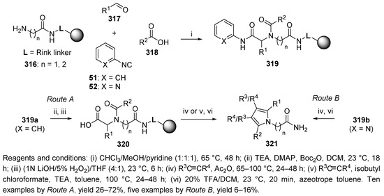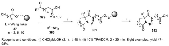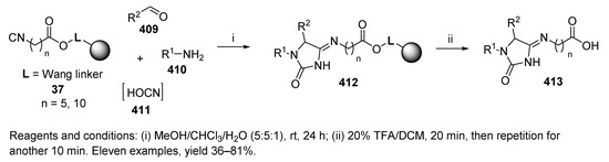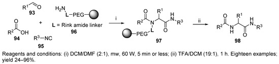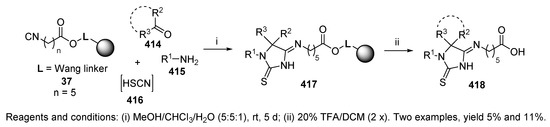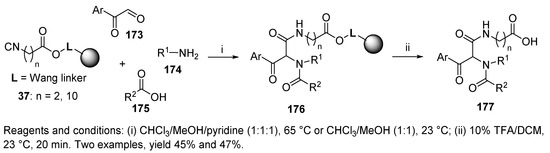 - Kim, S.W.; Bauer, S.M.; Armstrong, R.W. Construction of combinatorial chemical libraries using a rapid and efficient solid phase synthesis based on a multicomponent condensation reaction. Tetrahedron Lett. 1998, 39, 6993–6996. [Google Scholar] [CrossRef]
