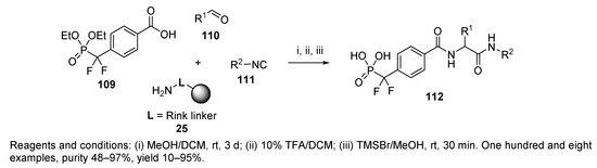 - Li, Z.; Yeo, S.L.; Pallen, C.J.; Ganesan, A. Solid-phase synthesis of potential protein tyrosine phosphatase inhibitors via the Ugi four-component condensation. Bioorg. Med. Chem. Lett. 1998, 8, 2443–2446. [Google Scholar] [CrossRef]