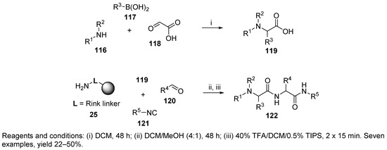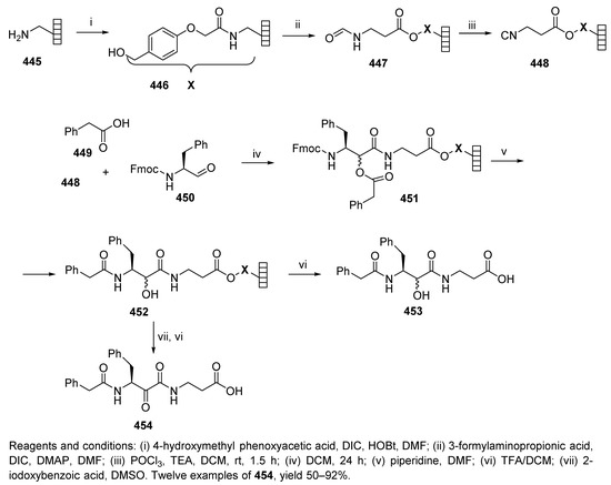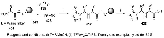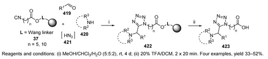 - Short, K.M.; Ching, B.W.; Mjalli, A.M.M. Exploitation of the Ugi 4CC reaction: Preparation of small molecule combinatorial libraries via solid phase. Tetrahedron 1997, 53, 6653–6679. [Google Scholar] [CrossRef]