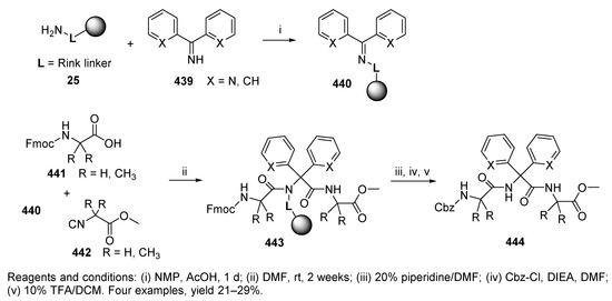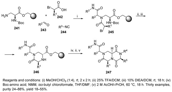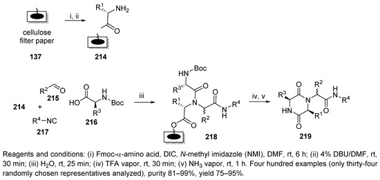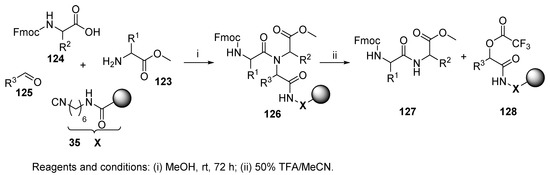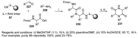 - Scott, B.O.; Siegmund, A.C.; Marlowe, C.K.; Pei, Y.; Spear, K.L. Solid phase organic synthesis (SPOS): A novel route to diketopiperazines and diketomorpholines. Mol. Divers. 1996, 1, 125–134. [Google Scholar] [CrossRef]