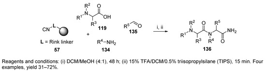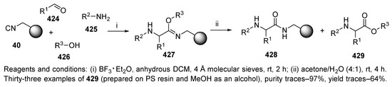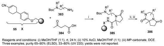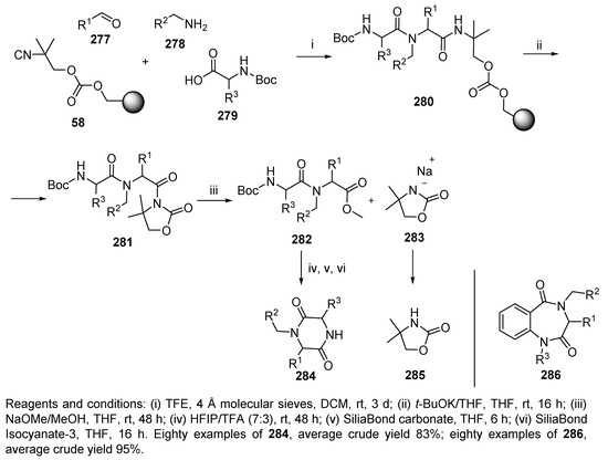 - Kennedy, A.L.; Fryer, A.M.; Josey, J.A. A New Resin-Bound Universal Isonitrile for the Ugi 4CC Reaction: Preparation and Applications to the Synthesis of 2,5-Diketopiperazines and 1,4-Benzodiazepine-2,5-diones. Org. Lett. 2002, 4, 1167–1170. [Google Scholar] [CrossRef]