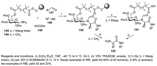 - Oertel, K.; Zech, G.; Kunz, H. Stereoselective Combinatorial Ugi-Multicomponent Synthesis on Solid Phase. Angew. Chem. Int. Ed. 2000, 39, 1431–1433. [Google Scholar] [CrossRef]