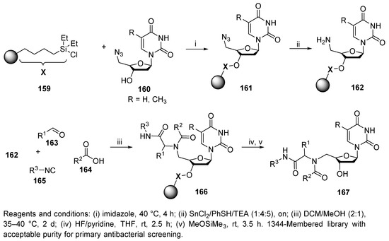 - Sun, D.; Lee, R.E. Solid-Phase Synthesis Development of a Thymidinyl and 2′-Deoxyuridinyl Ugi Library for Anti-bacterial Agent Screening. Tetrahedron Lett. 2005, 46, 8497–8501. [Google Scholar] [CrossRef]