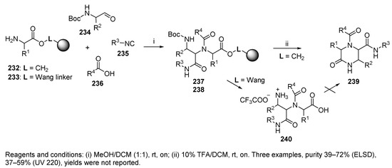 - Golebiowski, A.; Jozwik, J.; Klopfenstein, S.R.; Colson, A.O.; Grieb, A.L.; Russell, A.F.; Rastogi, V.L.; Diven, C.F.; Portlock, D.E.; Chen, J.J. Solid-Supported Synthesis of Putative Peptide β-Turn Mimetics via Ugi Reaction for Diketopiperazine Formation. J. Comb. Chem. 2002, 4, 584–590. [Google Scholar] [CrossRef]