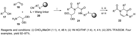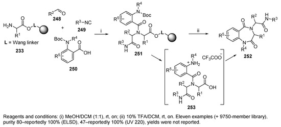 - Hulme, C.; Peng, J.; Morton, G.; Salvino, J.M.; Herpin, T.; Labaudiniere, R. Novel safety-catch linker and its application with a Ugi/De-BOC/Cyclization (UDC) strategy to access carboxylic acids, 1,4-benzodiazepines, diketopiperazines, ketopiperazines and dihydroquinoxalinones. Tetrahedron Lett. 1998, 39, 7227–7230. [Google Scholar] [CrossRef]