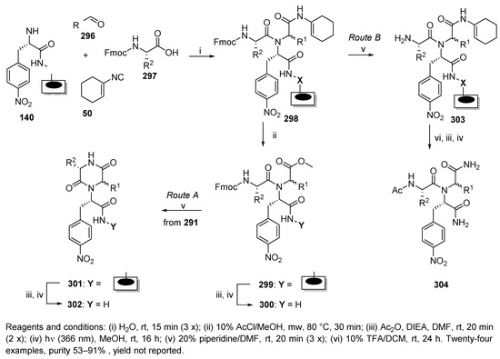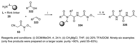 - Lin, Q.; Blackwell, H.E. Rapid synthesis of diketopiperazine macroarrays via Ugi four-component reactions on planar solid supports. Chem. Commun. 2006, 2884–2886. [Google Scholar] [CrossRef] [PubMed]
