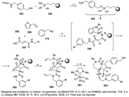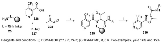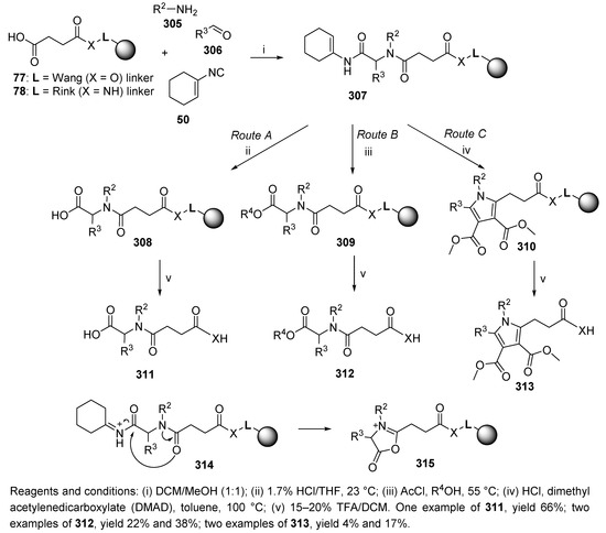 - Banfi, L.; Guanti, G.; Riva, R.; Basso, A. Multicomponent Reactions in Solid-Phase Synthesis. Curr. Opin. Drug Discov. Dev. 2007, 10, 704–714. [Google Scholar]