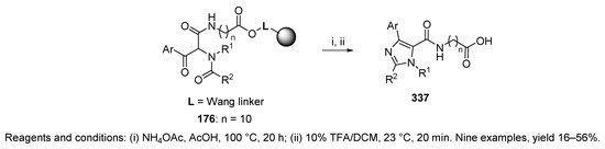 - Zhang, C.; Moran, E.J.; Woiwode, T.F.; Short, K.M.; Mjalli, A.M.M. Synthesis of tetrasubstituted imidazoles via α-(N-acyl-N-alkylamino)-β-ketoamides on Wang resin. Tetrahedron Lett. 1996, 37, 751–754. [Google Scholar] [CrossRef]