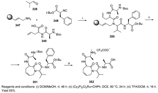 - Piscopio, A.D.; Miller, J.F.; Koch, K. Ring closing metathesis in organic synthesis: Evolution of a high speed, solid phase method for the preparation of β-turn mimetics. Tetrahedron 1999, 55, 8189–8198. [Google Scholar] [CrossRef]