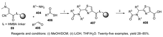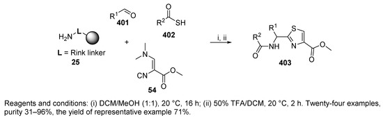 - Henkel, B.; Sax, M.; Dömling, A. A new and efficient multicomponent solid-phase synthesis of 2-acylaminomethylthiazoles. Tetrahedron Lett. 2003, 44, 3679–3682. [Google Scholar] [CrossRef]