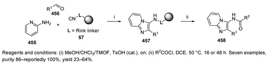 - Chen, J.J.; Golebiowski, A.; McClenaghan, J.; Klopfenstein, S.R.; West, L. Universal Rink-isonitrile resin: Application for the traceless synthesis of 3-acylamino imidazo[1,2-a]pyridines. Tetrahedron Lett. 2001, 42, 2269–2271. [Google Scholar] [CrossRef]