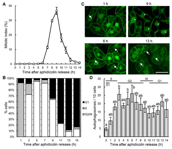 We used the transgenic tobacco BY-2 cell line (BY-YA8), constitutively over-expressing the YFP-NtATG8a fusion protein, under the control of cauliflower mosaic virus (CaMV) 35S promoter, to visualize the autophagosomes [33]. To analyze the dynamics of autophagosome formation during cell cycle progression, a 7-day-old BY-YA8 suspension culture was synchronized using aphidicolin treatment. After releasing the cells from the aphidicolin block, cell cycle progression was monitored by both determining the mitotic index and by flow cytometric analysis (Figure 1A,B). The mitotic index, which indicates the proportion of cells in the M phase, increased from 7 h after the aphidicolin release, peaked at approximately 40% 9 h after release, and then decreased, which is consistent with the previous literature studying cell-cycle-specific events in tobacco BY-2 cells [31,32]. Flow cytometric analysis revealed that more than 90% of the cells were in the S phase 1 h after the aphidicolin release, and 90% of the cells were in the G2 phase 5 h after the release (Figure 1B). Therefore, cell cycle stages were highly synchronized for at least 5 h after the aphidicolin release.