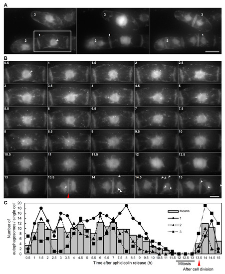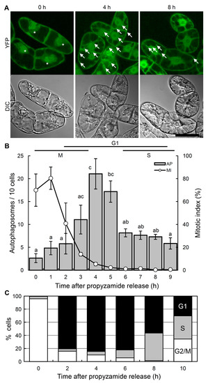 In animal and yeast cells, autophagy is closely linked to cell cycle-related development, such as cell differentiation, programmed cell death, as well as cell division [15,16,17]. In animal cells, autophagy is induced preferentially in the G1 and S phases of the cell cycle by various autophagy activators and starvation, and is inhibited during mitosis [18,19,20]. Starvation-induced autophagy is known to be crucially involved in the cell cycle progression from the G2/M to the G1 phase in yeast [21].