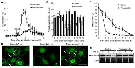 As shown in Figure 3, the number of autophagosomes transiently decreased with the increase in the number of mitotic cells. Thus, we hypothesized that autophagic activity may change during cell cycle progression from the G2 phase to the M phase. To confirm this hypothesis, we analyzed the effect of a cyclin-dependent kinase (CDK) inhibitor roscovitine, which blocks the G2/M transition in tobacco BY-2 cells [37]. Five h after the release, which corresponded to the early G2 phase, aphidicolin-synchronized cells were incubated with or without roscovitine and cell cycle progression was monitored by determining the mitotic index (Figure 4A). Roscovitine inhibited an increase in the number of mitotic cells (Figure 4A) and blocked a decrement of autophagosomes (Figure 4B,C). During the cell cycle progression from the M phase to the G1 phase, we also observed a decrease in the fluorescent signals of the YFP-NtATG8a protein (Figure 4D,E), which is presumably attributed to the induction of autophagy [38]. These results indicate that a decrease in the number of autophagosomes is induced during the G2/M transition of the cell cycle, and the autophagic activity is regulated in a cell-cycle-dependent manner in tobacco BY-2 cells.