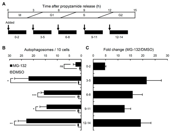 MG-132-inducible increments in the number of autophagosomes at each phase of the cell cycle. BY-YA8 cells were synchronized at the M phase using aphidicolin/propyzamide treatment. MG-132 (100 μM) was applied 0–2 h (M phase), 3–5 h (G1 phase), 6–8 h (G1–S phase), 9–11 h (S–G2 phase), and 12–14 h (G2 phase) after release from the propyzamide block. (A) Time-course graph of the treatment with MG-132 after propyzamide was removed. (B) The levels of autophagy at 2 h, 5 h, 8 h, 11 h, and 14 h, respectively. (C) The relative levels of autophagy were standardized with controls at each point as 1. DMSO was used as the control. Bars are the means ± SE of three independent experiments. * p < 0.05, ** p < 0.005, *** p < 0.001; significantly different from the controls.