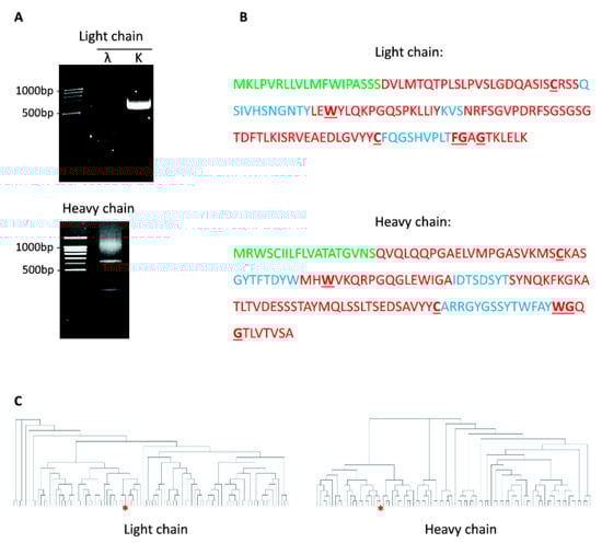 - Meyer, L.; López, T.; Espinosa, R.; Arias, C.F.; Vollmers, C.; DuBois, R.M. A simplified workflow for monoclonal antibody sequencing. PLoS ONE 2019, 14, e0218717. [Google Scholar] [CrossRef]