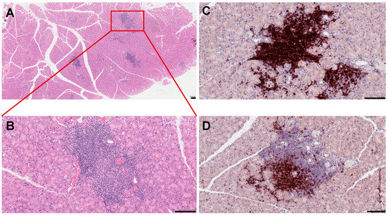 Histopathological features of mouse lacrimal gland at 3 months of age. (A) Histochemical staining of paraffin-embedded mouse lacrimal gland sections with hematoxyllin-eosin (H&E). (B) Higher magnification reveals severe infiltration of immune cells in the lacrimal gland. (C) Immunostaining of the NOD mouse lacrimal gland sections with the B220 antibody (B cell marker) (D) and CD3 antibody (a marker of T cells). Each scale bar is 100 μm.