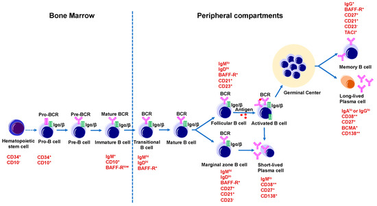 B cells or B-lymphocytes have a specific function in the production of antibodies and play an important role in humoral immunity. In addition, B cells have diverse immunoglobulin (Ig) cell surface receptors that are able to identify different antigens [64]. Early B cell development [65] happens in the bone marrow from hematopoietic precursor cells (HSC), which differentiates into common lymphoid progenitor cells (CLP). Lymphoid progenitor cells start differentiating after receiving a signal from stromal B cells via cytokine secretion and cell–cell interaction. B cell development depends on the Ig gene rearrangement [66], leading to the production of antibodies to specific antigens. Thus, CLP’s differentiate into Pro-B cells (CD34+ /CD10+ /CD22+ /CD19−) that undergo Ig gene rearrangements and differentiate into Pre-B, which now express the B-lineage-specific cell surface molecule CD19. Pre-B cells gain heterogeneous CD20 expression and pre-BCR receptors and finally differentiate into immature B cells [67]. After this, immature B cell leaves the bone marrow and enters peripheral compartments like the spleen. The spleen is made up of various regions like the follicular region, which mainly consists of B cells. A marginal zone surrounds the follicular region that consists mainly of T, B cells, and macrophages. The red pulp in the spleen is a red blood cell disposal site, while the paracortical region mainly contains of T cells [68]. In the absence of MHC class II T cell help, immature B cells rapidly respond to T cell-independent type I antigens like lipopolysaccharides, and produce a quick antibody response. Additionally, immature B cells further develop into transitional B cells and then into mature B cells [65] (Figure 2).